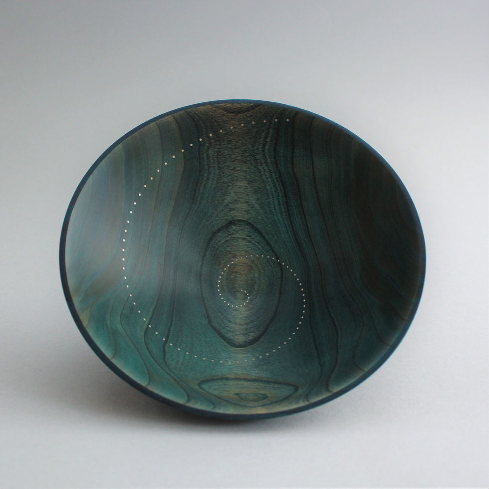I specialise in making very distinctive one-off bowls and vessels, usually thinwalled, inlaid with silver or gold, and colored with wood dyes. I work mostly in European sycamore, whose pale surface is an excellent canvas for my coloring techniques; occasionally I use other woods such as cherry, hornbeam and walnut. I use water-based dyes, which have the effect of enhancing the lines of grain and figuring in the wood; I choose the colors carefully, to complement the inherent qualities of each particular piece.